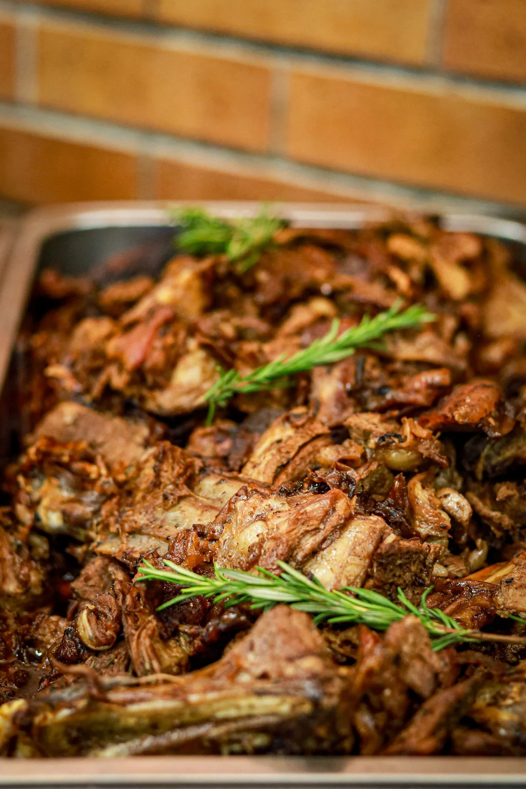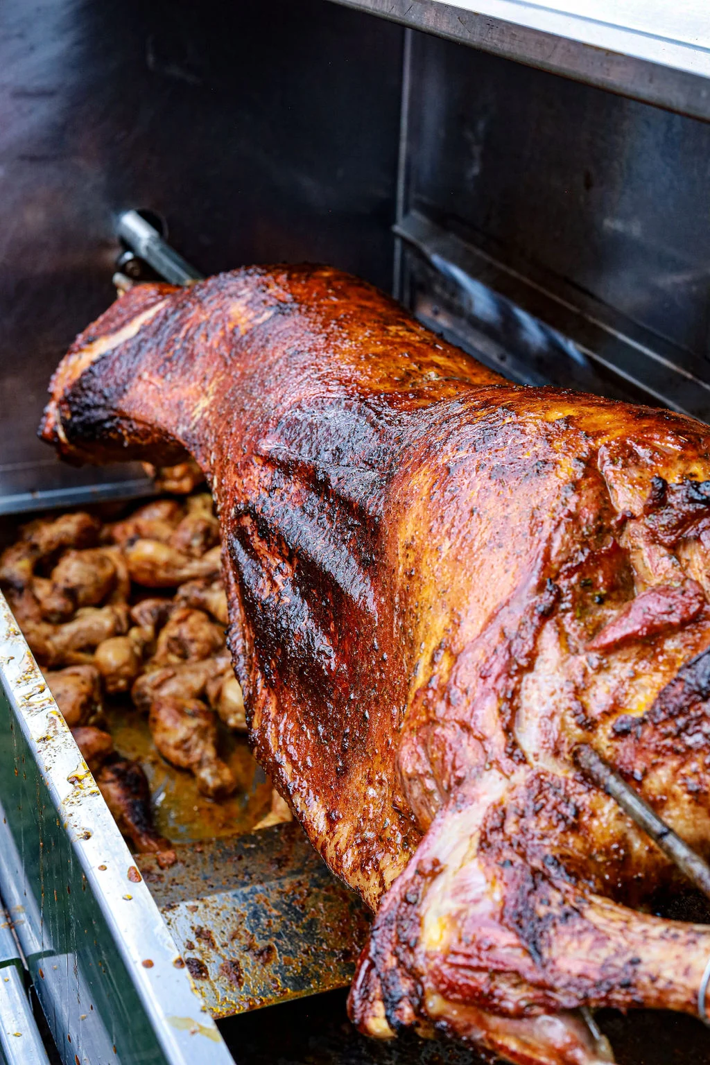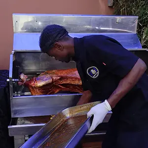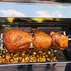 At Theo's, a whole lamb cooks to perfection in 2-3 hours. After the Pork / Lamb is cooked we will carve the meat (30-45 minutes) into our machine where we baste it with our amazing (and very secret!) basting sauce. Now we are ready to serve...